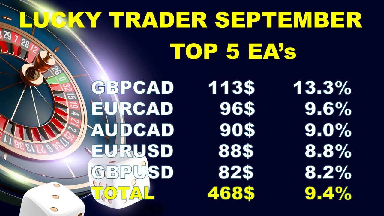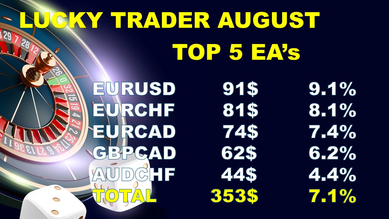 Here you will find the weekly testing progress with the Lucky Trader EA/Robot in a quick and easy profit overview. We trade the EA on 16 different currency pairs such as AUDCHF, AUDUSD, EURCHF, EURGBP, EURUSD, GBPUSD, NZDUSD, USDCAD.