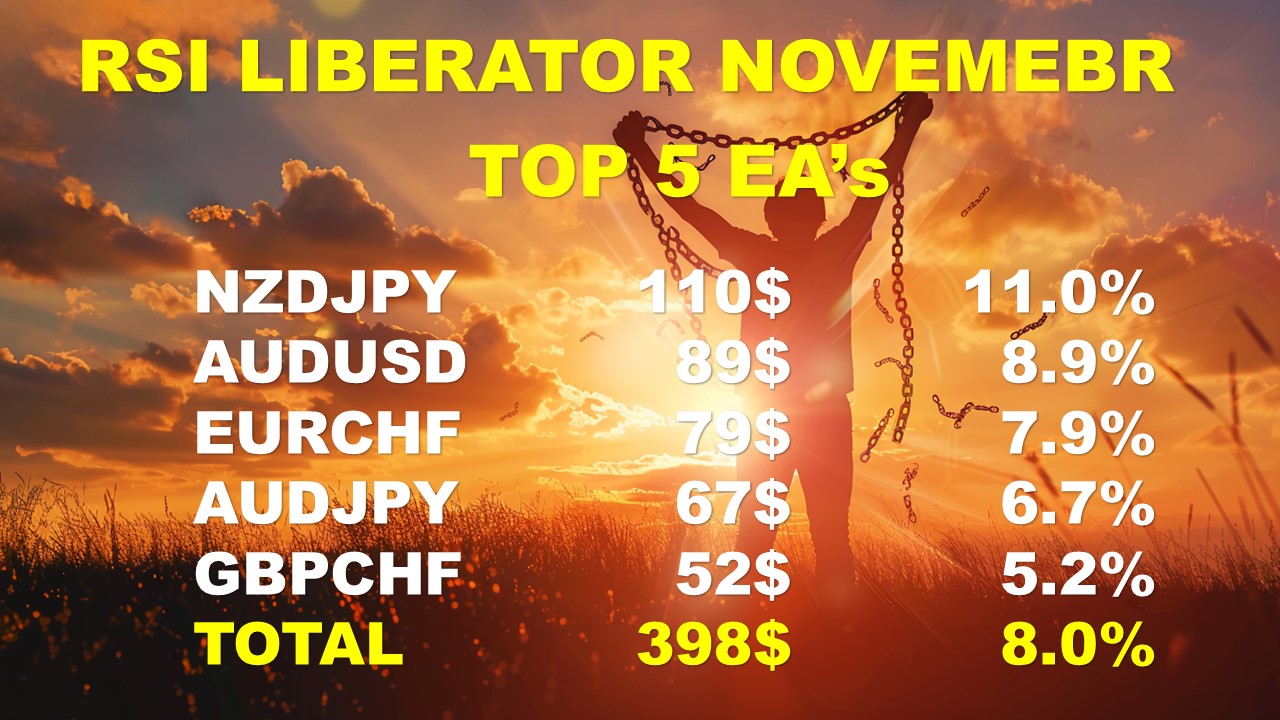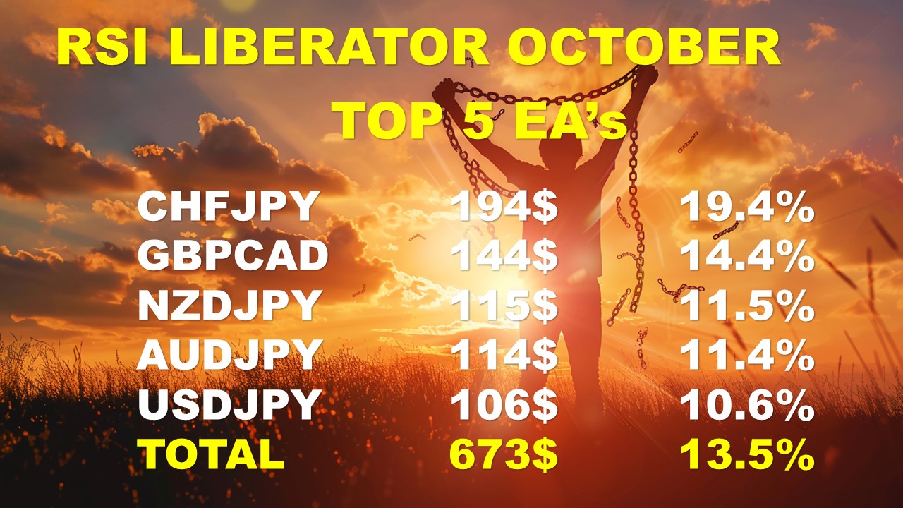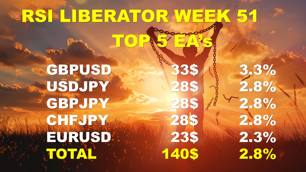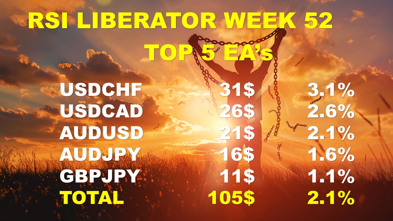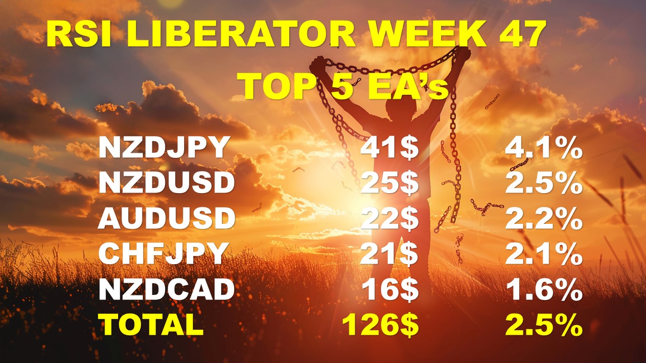 Here you will find the weekly progress of the testing with the RSI Liberator EA/Robot in a quick and easy profit overview. We trade the EA on 22 different currencies such as AUDCAD, AUDCHF, AUDJPY, AUDNZD, AUDUSD, CHFJPY, CADCHF, EURCAD, EURCHF, EURGBP, EURUSD, GBPCAD, GBPCHF, GBPJPY, GBPUSD, NZDCAD, NZDCHF, NZDJPY, NZDUSD, USDCAD, USDCHF, USDJPY or now as individual currency pairs.