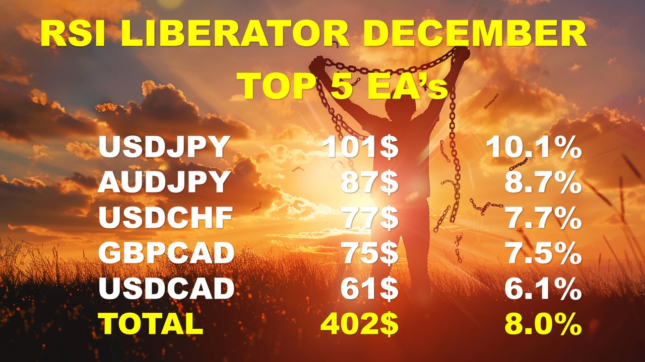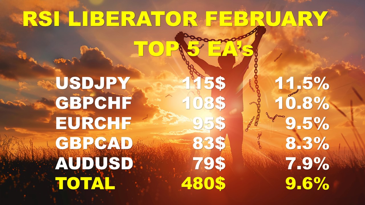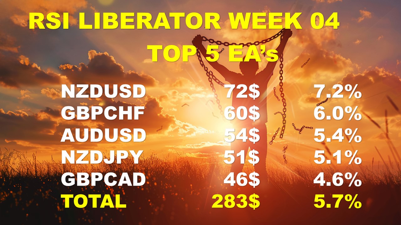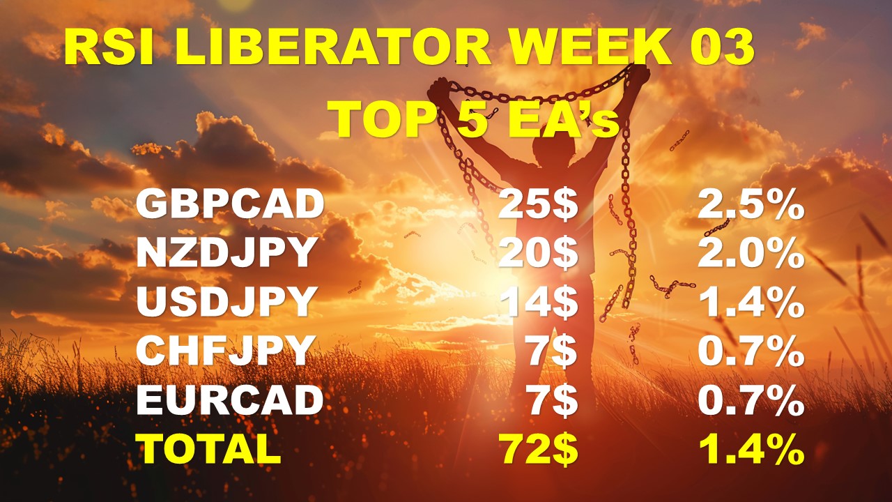 Here you will find the weekly progress of the testing with the RSI Liberator EA/Robot in a quick and easy profit overview. We trade the EA on 22 different currencies such as AUDCAD, AUDCHF, AUDJPY, AUDNZD, AUDUSD, CHFJPY, CADCHF, EURCAD, EURCHF, EURGBP, EURUSD, GBPCAD, GBPCHF, GBPJPY, GBPUSD, NZDCAD, NZDCHF, NZDJPY, NZDUSD, USDCAD, USDCHF, USDJPY or now as individual currency pairs.